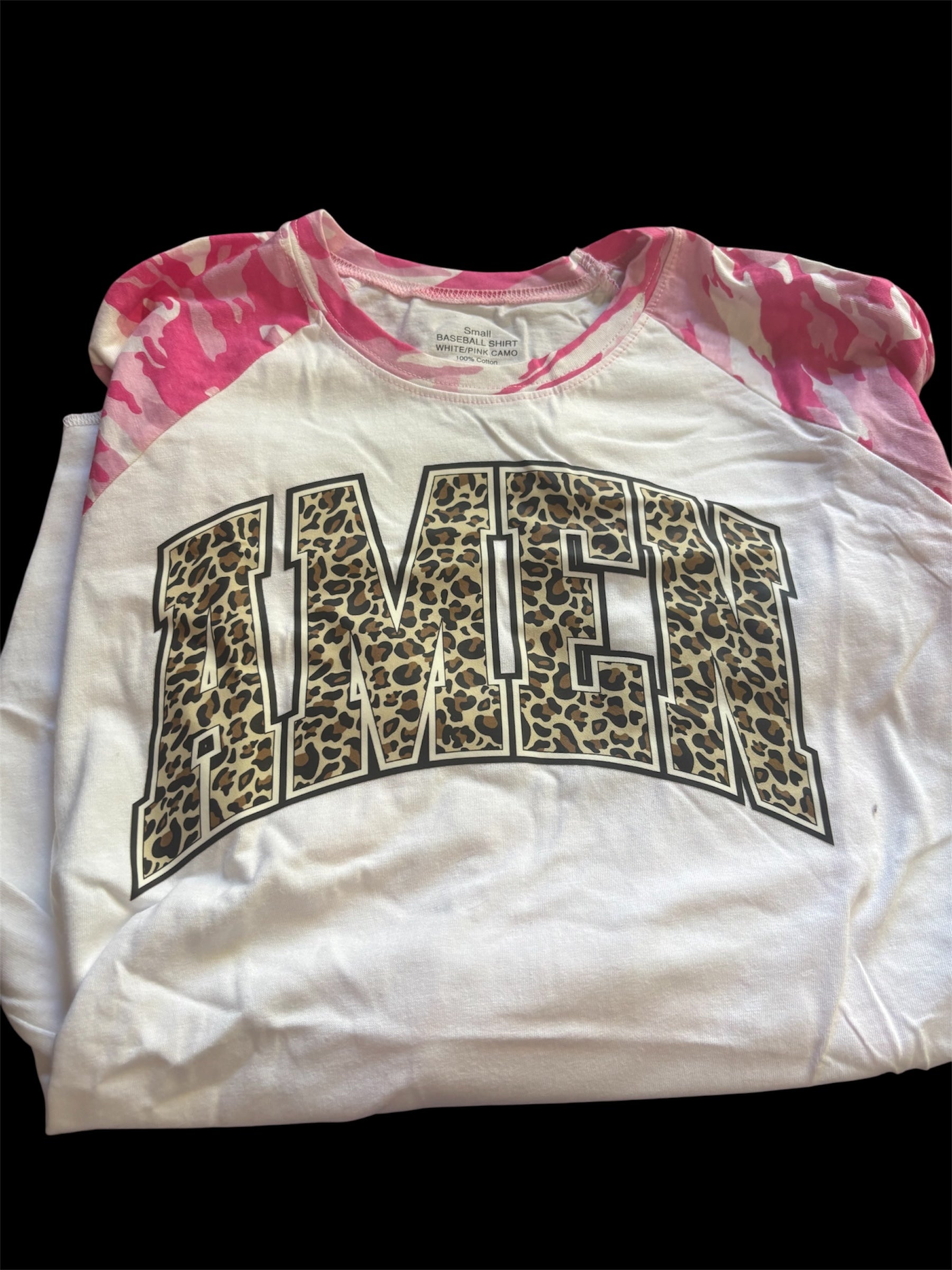 Leopard Amen raglan pink camo sleeves white body